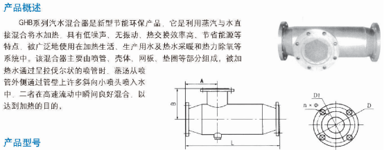 GHB系列汽水混合器是新型節(jié)能環(huán)保產(chǎn)品, 它是利用蒸汽與水直 接混合將水加熱,具有低噪聲、無振動,熱交換效率高,節(jié)省能源等 特點、被廣泛地使用在加熱生活、生產(chǎn)用水及熱水采